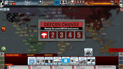 Twilight Struggle (all screenshots from the PC version) is a grand strategy board game in which players recreate the epic Cold War between the forces of liberal capitalist democracy, as championed by the USA, and the ideology of revolutionary communism that birthed the USSR. The game is played on a world map of interconnected countries, the network terminating in each of the two clashing superpowers. The players compete for control of these countries by building their influence points to a margin exceeding a certain threshold of stability. Each player has a hand of cards which have both an "ops" value and an associated historical event. Play proceeds through either spending those points for defined game actions or triggering the events, which have unique mechanical benefits. However, if a player uses an event card belonging to the opposing player for ops, they must allow their opponent to gain the benefit of the event, leading to a risky and calculating game of cat and mouse. Players may spread their influence slowly but peacefully, or they may take an aggressive posture, launching coups d'état to rapidly shift the balance in their favour. However, doing so may degrade the DEFCON level, reducing your options and making such dirty tricks less desirable, and if it is reduced from five to one the world ends in nuclear apocalypse (technically the player that triggered Mutual Assured Destruction loses, but in a truer sense, there is no winner). They may also compete for scientific and technological dominance in the space race. Players score victory points when cards are played determining the balance of power on each individual continent, with a net score of 20 or the higher score at the end of three phases of the war winning.